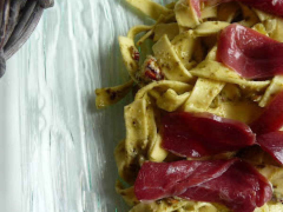 Tagliatelles au pesto, aux noisettes et au magret de canard séché.