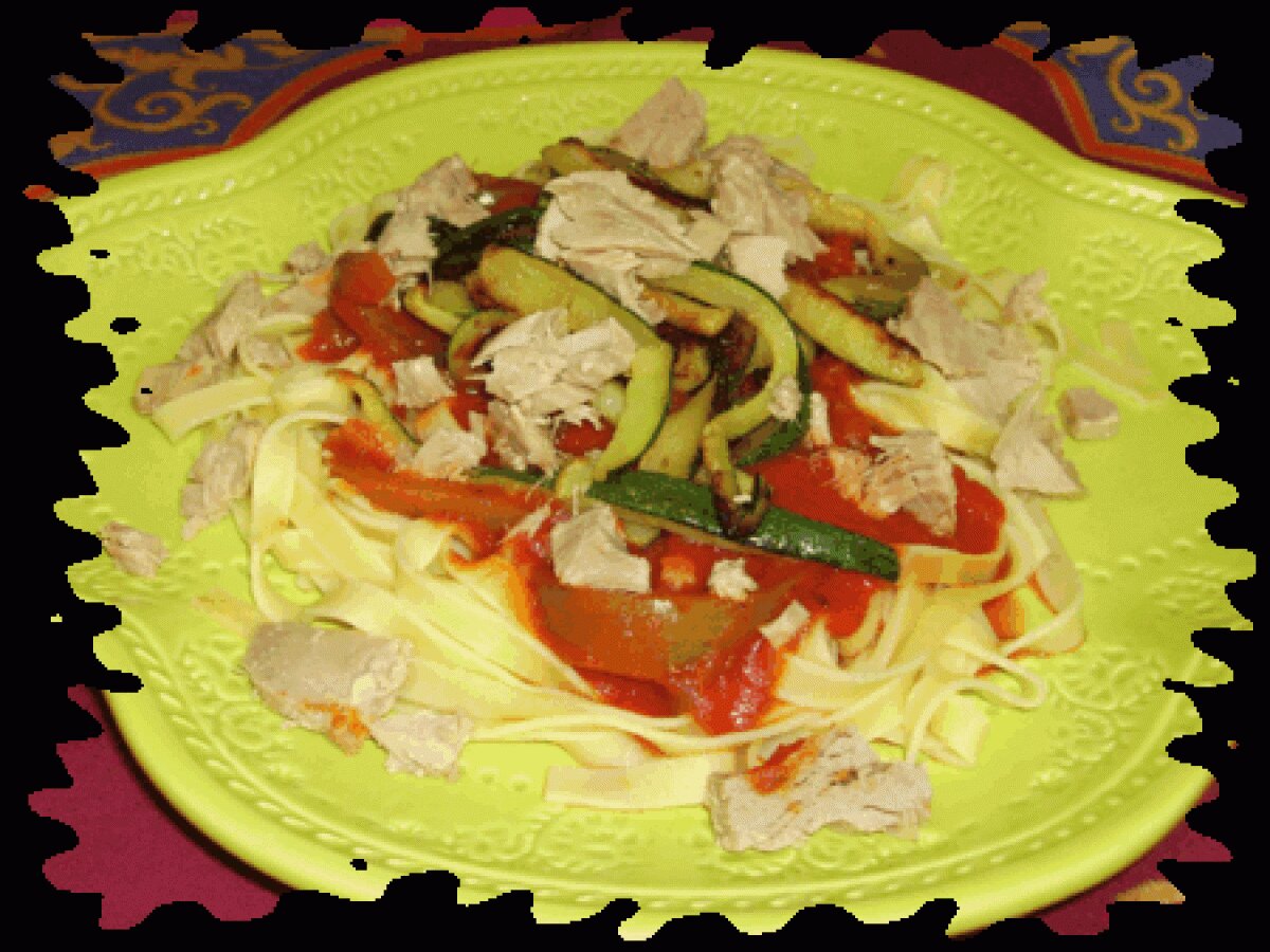 Tagliatelles au thon et legumes du soleil votez maintenant Platfacile40 min Envoyer cette recette à un ami Imprimer cette page Poser une question à l'auteur Publier votre photo de cette recette Ingrédients 4 1 paquet de tagliatelles 1 grosse boîte de thon en conserve 1 brique de coulis de tomate de 500 ml 1 belle courgette 1 ou 2 poivrons suivant leurs tailles Sel, poivre, aromates (au choix)