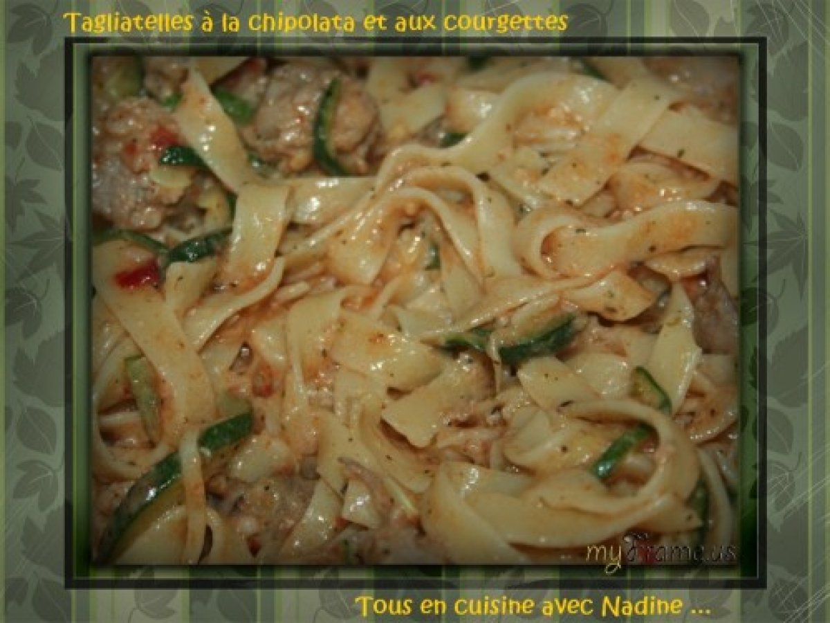 Tagliatelles aux courgettes et à la chipolata Platfacile25 min952 Kcal Envoyer cette recette à un ami Imprimer cette page Poser une question à l'auteur Publier votre photo de cette recette Ingrédients 4 600 gr de tagliatelles 400 gr de chipolata (saucisses de veau pour la version allégée) 800 gr de courgettes 2 tomates herbes de Provence 1 cube de bouillon de poule (dégraissé pour la version allégée) 2 dl de crème (15%pour la version allégée) sel poivre Huile d'olive