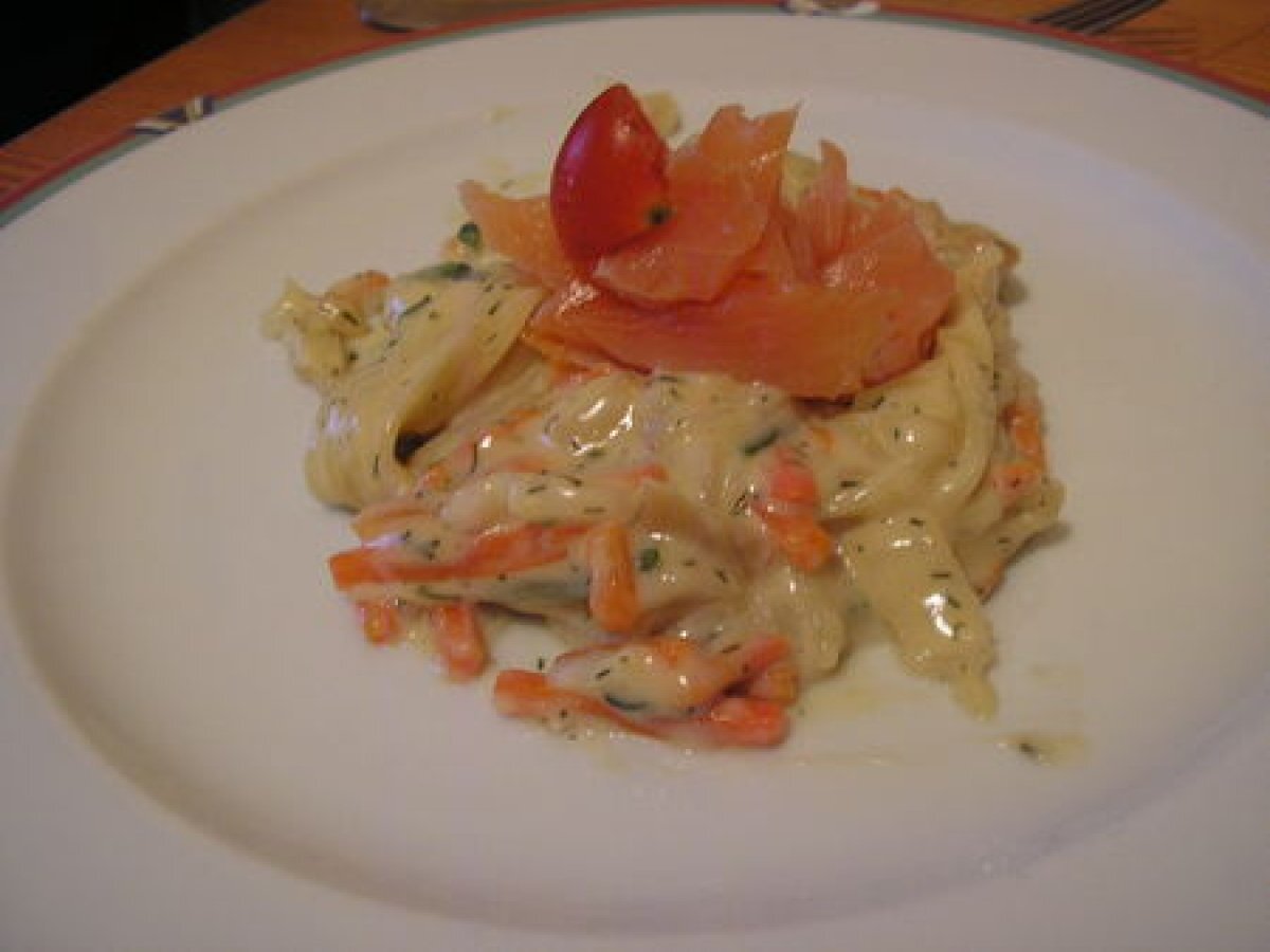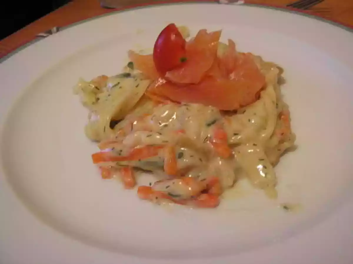 Tagliatelles aux petits légumes sauce légère et saumon fumé Platfacile25 min Envoyer cette recette à un ami Imprimer cette page Poser une question à l'auteur Publier votre photo de cette recette Ingrédients 4 300 g de taliatelles 1/2 sachet de julienne de légumes surgelé 1 oignon 1 brique de 340 g de lait concentré non sucré (type gloria) 2 cuillères à soupe rases de maïzena 3 cuillères à café de fumet de poisson aneth séchée ou fraiche selon le goût sel 1 cuillère à soupe d'huile d'olive 200 g de saumon fumé 1 tomate cerise coupée en 4 pour la présentation