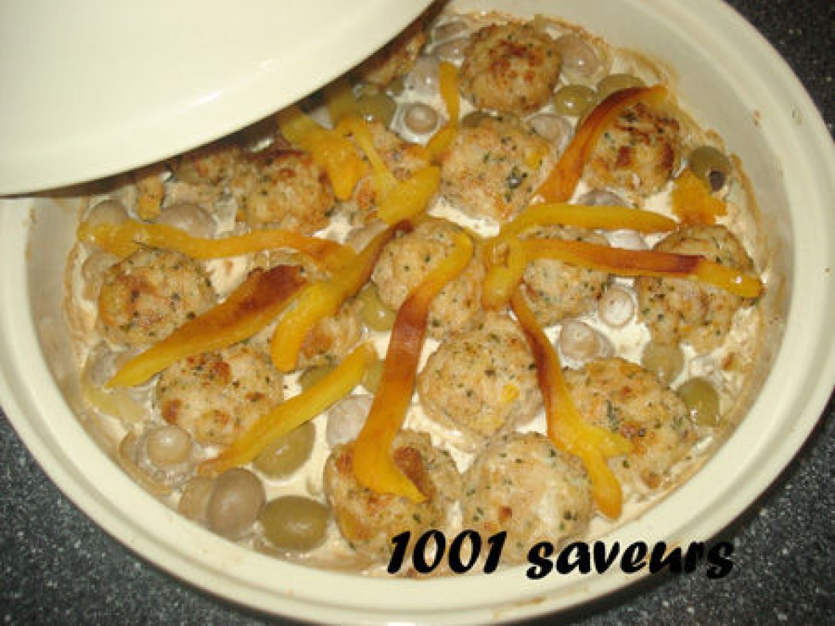 Tajine de boulettes de poisson farçies aux olives Platfacile40 min713 Kcal Envoyer cette recette à un ami Imprimer cette page Poser une question à l'auteur Publier votre photo de cette recette Ingrédients 4 Pour les boulettes : 1 kg de filets de poisson blanc 2 cuillères à soupe de persil haché 2 cuillères à soupe de coriandre hachée 1 piment 1 poivron rouge grillé et épluché 50 g de de mie de pain 4 cuillères à soupe de lait 1 cuillère à soupe de vinaigre ½ cuillère à café de cumin en poudre ½ cuillère à café de gingembre en poudre ½ cuillère à café de paprika ½ cuillère à café de poivre 1 cuillère à café de sel 100 g d'olives vertes dénoyautées Pour la sauce : 1 oignon en fines lamelles 4 gousses d'ail non épluchées 200 g de champignons 100 g d'olives vertes dénoyautées 150 ml de crème fraîche Persil et tranche de citron pour le décoration Coût estimé: 13.94Euros€ (3.49€/part)