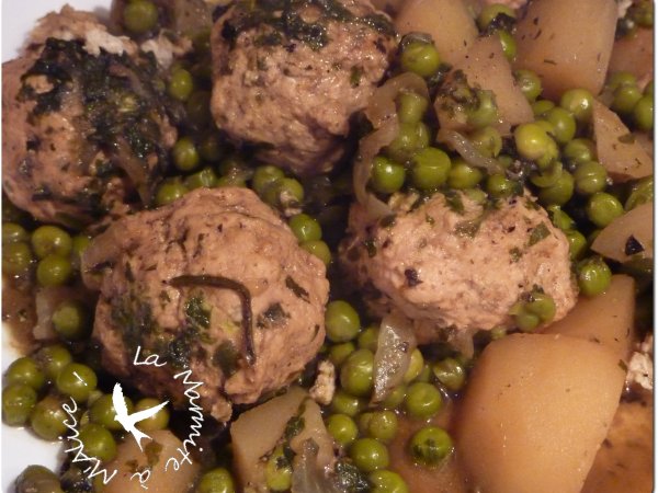 Tajine de keftas de poulet, petits pois et pommes de terre Platfacile1 h 5 m668 Kcal Envoyer cette recette à un ami Imprimer cette page Poser une question à l'auteur Publier votre photo de cette recette Ingrédients 4 500 g de viande de poulet hachée 4 petites pommes de terre 300 g de petits pois (surgelés pour moi) 1 oignon 1/2 botte de persil plat 1/2 botte de coriandre 2 cuillères à café de gingembre 2 cuillères à café de cumin moulu 2 cuillères à café de coriandre moulue 1/2 cuillère à café de curcuma Sel et poivre noir moulu 6 cuillères à soupe d'huile d'olive Coût estimé: 10.9Euros€ (2.72€/part)