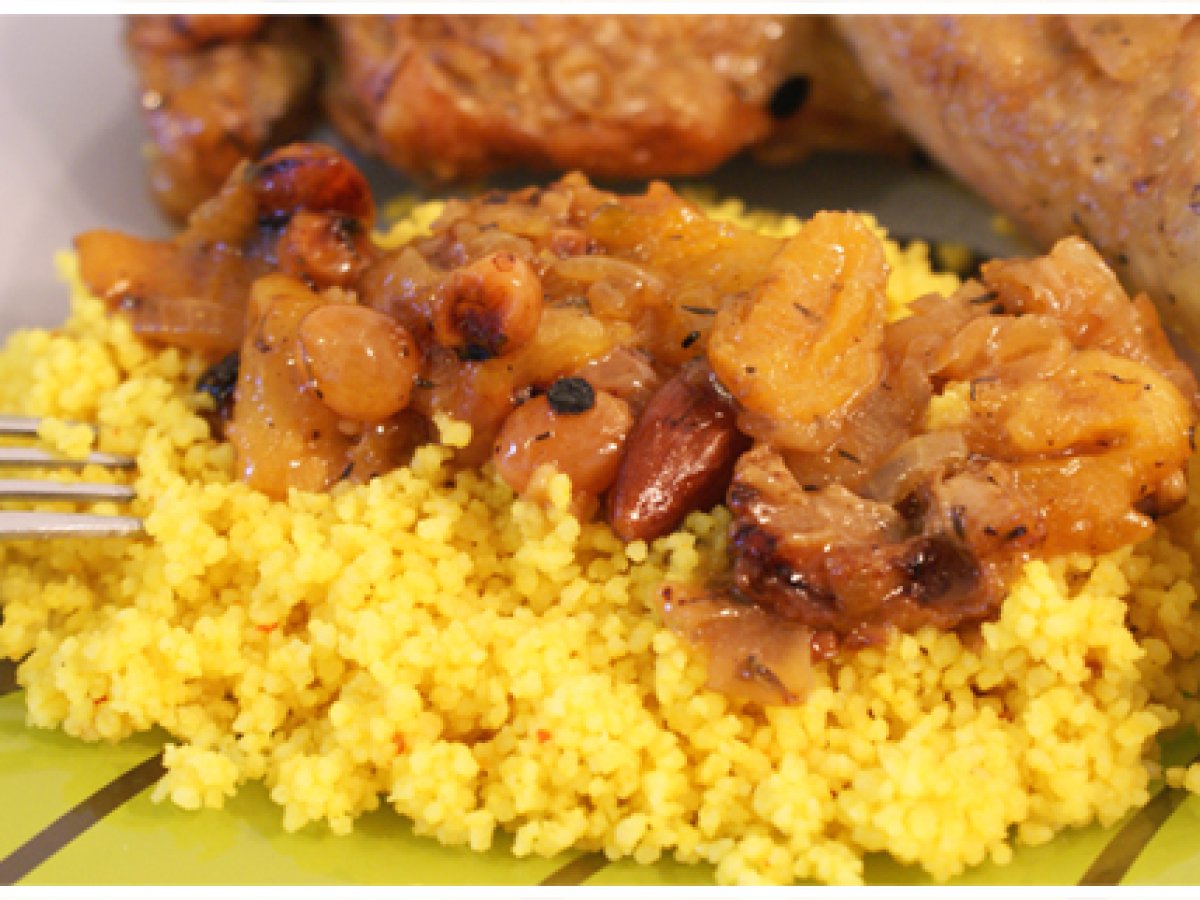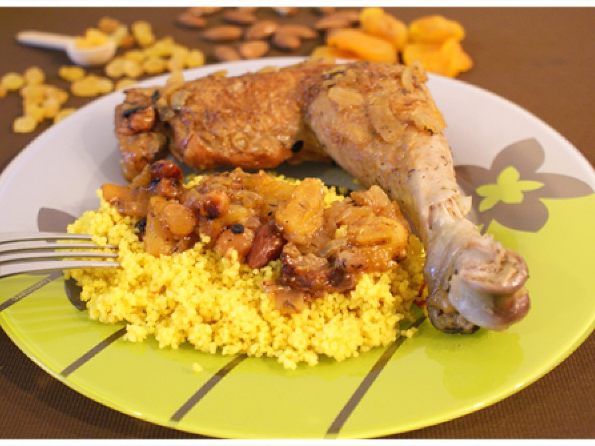 Tajine de poulet aux abricots et raisins secs PrécédentSuivant Platfacile1 h 15 m Envoyer cette recette à un ami Imprimer cette page Poser une question à l'auteur Publier votre photo de cette recette Ingrédients 6 Pour le tajine : 4 cuisses de poulet 75 g de raisins secs 40 g d'amandes entières 125 g d'abricots secs 2 gros oignons 1 gousse d'ail 1 bouquet garni 1 cuillère à café de cumin 1 cuillère à café de cannelle en poudre 2 pincées de noix de muscade fraîchement râpée 40 cl de bouillon de volaille Un peu de beurre et d'huile de tournesol Sel Pour la semoule : De la semoule pour couscous, parfumée aux épices De l’huile d’olive 40 cl d’eau bouillante non salée