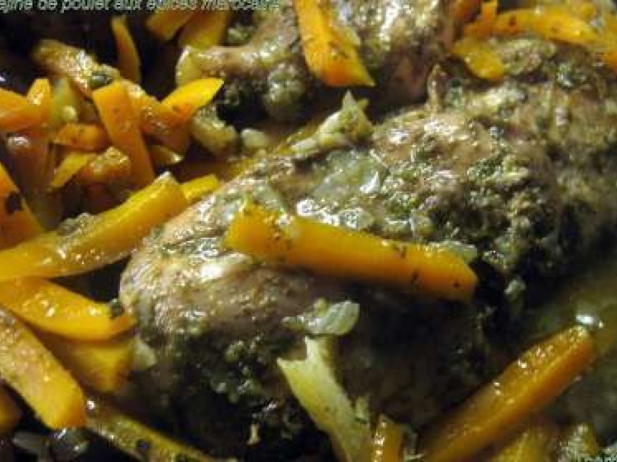 Tajine de poulet aux épices marocains PrécédentSuivant Platmoyen1 h 30 m Envoyer cette recette à un ami Imprimer cette page Poser une question à l'auteur Publier votre photo de cette recette Ingrédients 6 4 cuisses de poulet et 2 blancs 3 gousses d'ail pressées 3 càs d'épices marocains (ou épices à tagine) 1 poignée de coriandre fraîche 2 càs d'huile d'olive 4 oignons coupés en cubes 1 verre à moutarde de bouillon de volaille 5 belles carottes écorces de citron confit olives violettes Sel et poivre