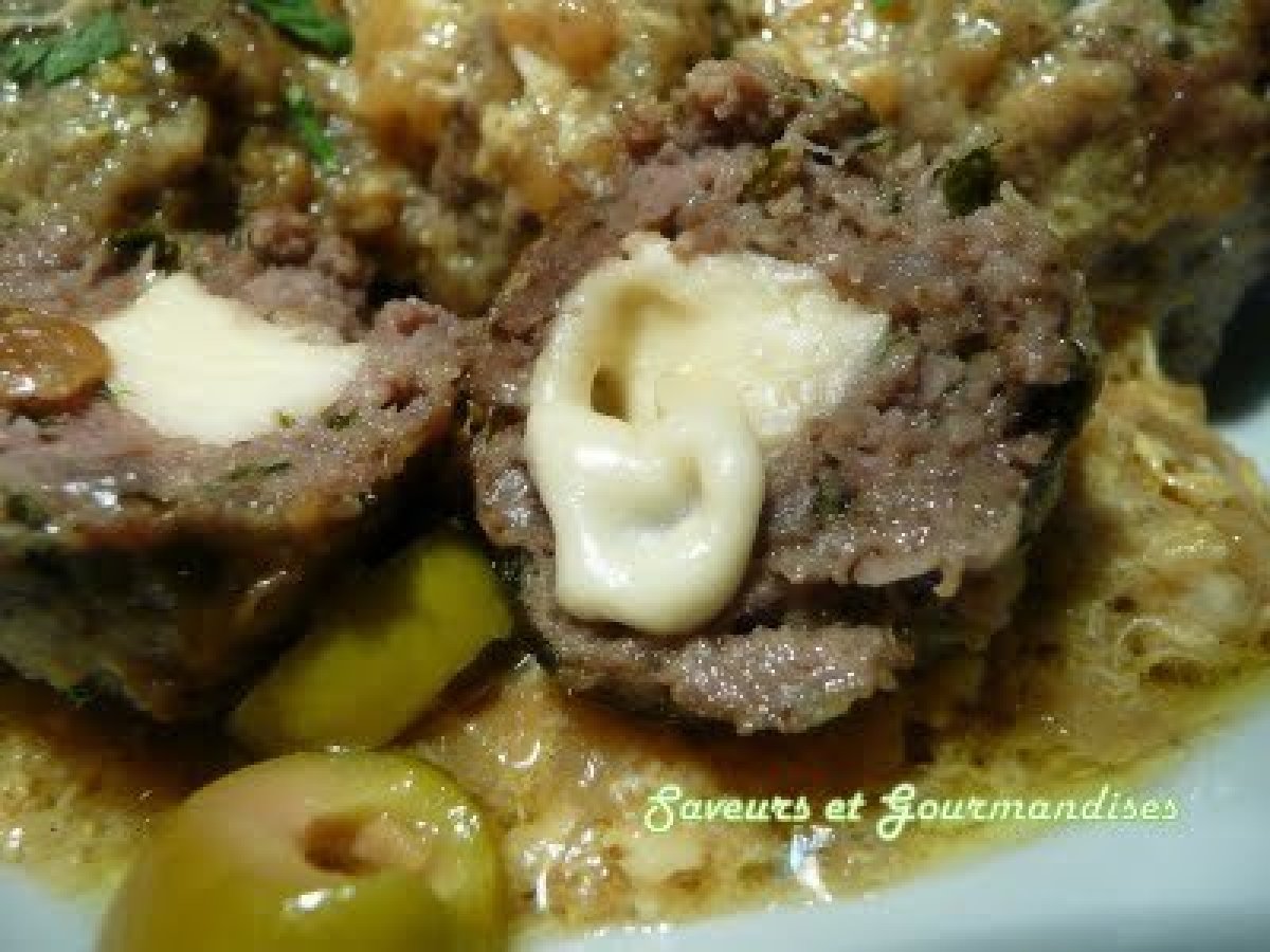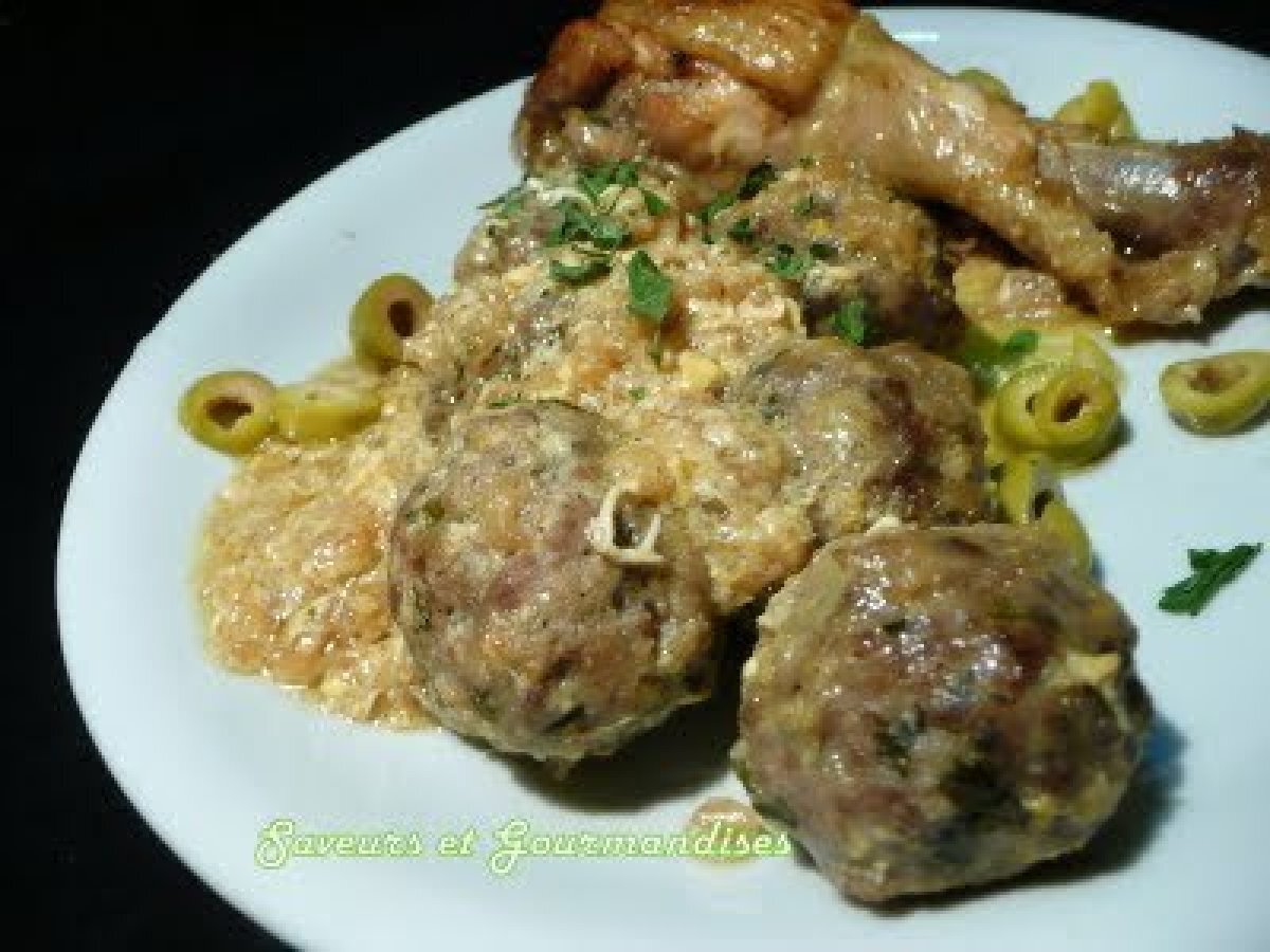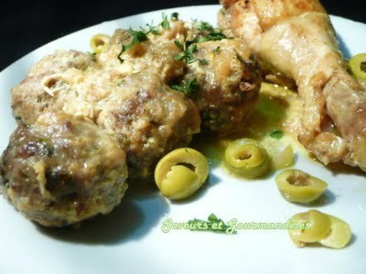 Tajine de poulet et boulettes surprise PrécédentSuivant Platmoyen1 h 45 m Envoyer cette recette à un ami Imprimer cette page Poser une question à l'auteur Publier votre photo de cette recette Ingrédients 4 4 cuisses de poulet 500 gr de viande hachée de boeuf De la mozzarella en petites boules ( ou autre fromage) 3 gros oignons 1 cube de légumes 1 cuillère à café de ras el hanout 150 gr d?olives vertes ou noires 1 oeuf ½ jus de citron De la farine De l?huile d?olive De l?huile pour friture 1 /2 botte de persil ou de la coriandre De la farine. "Marinade" poulet : 2 cuillères à soupe de moutarde 2 gousses d'ail écrasées 1 cuillère à café de gingembre moulu ( ou moins, selon goût) 1 cuillère à café de ras el hanout 1/2 cuillère à café de cumin Sel, poivre.