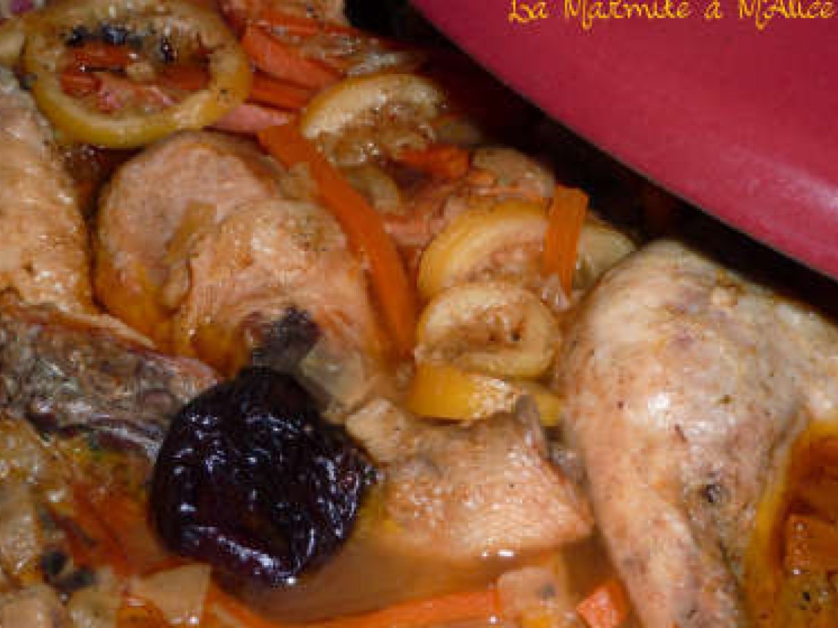 Tajine de poulet, pruneaux et citrons confits Platfacile2 heures Envoyer cette recette à un ami Imprimer cette page Poser une question à l'auteur Publier votre photo de cette recette Ingrédients 6 1 poulet coupé en morceaux 2 citrons confits 8 pruneaux 2 oignons 2 grosses carottes 4 cuillères à soupe de miel 1 bonne cuillère à café dharissa 1 tablette de bouillon de volaille 1 cuillère à café rase de gingembre moulu 2 cuillères à café rases de ras-el-hanout 15 grains de coriandre écrasés au mortier