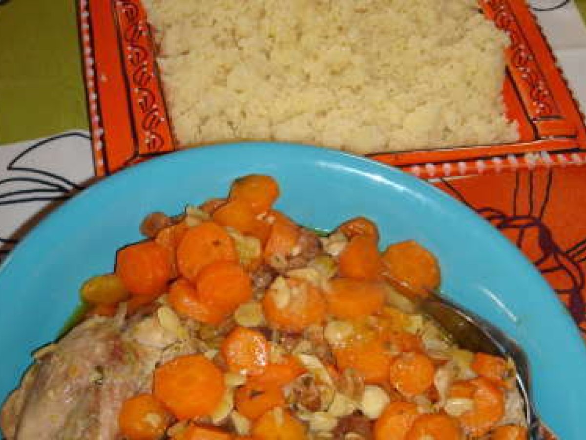 Tajine poulet carottes Platmoyen1 h 15 m Envoyer cette recette à un ami Imprimer cette page Poser une question à l'auteur Publier votre photo de cette recette Ingrédients 6 Pour 6 personnes : > 6 ou 12 morceaux de poulet selon leur taille > 1,2 kg de carottes > 100g de raisins secs > 100g d'amandes effilées > 8 abricots secs > 4 oignons > 2/3 cuillères à soupe d'huile d'olive > coriandre fraîche > 2 gousses d'ail > 1 bouquet garni > 1 cuillère à café de coriandre > 1 cuillère à café de cumin > 1 baton de cannelle > 1 pincée de muscade > 35 cl de bouillon de volaille ou de légumes