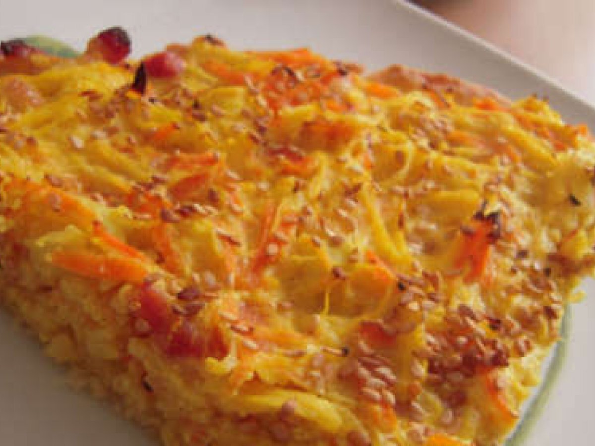 Tarte à la courge spaghetti ou l'éloge de l'automne selon arcimb PrécédentSuivant Platmoyen1 h 30 m Envoyer cette recette à un ami Imprimer cette page Poser une question à l'auteur Publier votre photo de cette recette Ingrédients 6 Une pâte levée Demi-courge spaghetti 100 gr de lardons 3 carottes, 1 courgette Echalote (fraiche, surgelée) Gingembre, Curcuma, une pointe de piment doux 20 cl de crème liquide 2 ufs Graines de sésame, sel, huile dOlive.