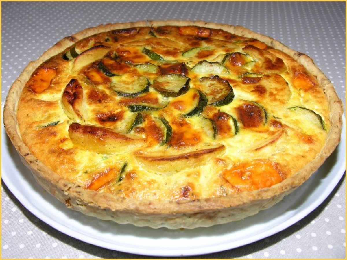 Tarte courgettes, pommes et cheddar Platfacile1 h 10 m856 Kcal Envoyer cette recette à un ami Imprimer cette page Poser une question à l'auteur Publier votre photo de cette recette Ingrédients 6 Pâte brisée : 250 g de farine 125 g de beurre mou 1 jaune d'oeuf 2 cuillères à café de mélange d'herbes aromatiques/tomates séchées 1 pincée de sel un peu d'eau Pour la tarte : 2 courgettes 2 pommes boskop 150 g de Cheddar vieux 3 oeufs 120 g de ricotta 150 g de crème fraîche au lait cru 1 cc de mélange d'herbes aromatiques/tomates séchées 12 gouttes d'huile essentielle "Délice & Sens" - Garrigue 50 g de beurre sel poivre Coût estimé: 7.75Euros€ (1.29€/part)