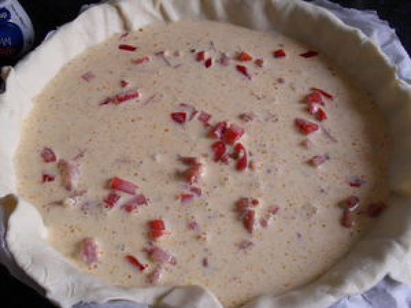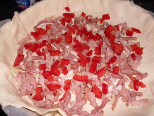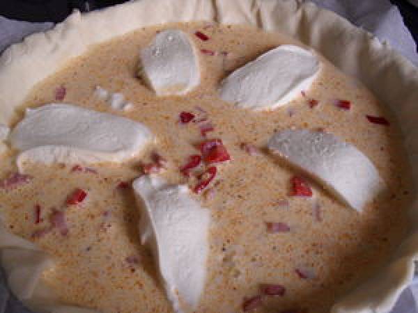 Tarte lardons -mozarella Platfacile35 min475 Kcal Envoyer cette recette à un ami Imprimer cette page Poser une question à l'auteur Publier votre photo de cette recette Ingrédients 4 1 pâte brisée 100g lardons fumés 100 g mozarella de bufflone 1/4 oignon nouveau 1/2 poivron coupé en cubes 3 oeufs 20 cl lait sel poivre 1 cuillère à café de pesto rosso Coût estimé: 3.92Euros€ (0.98€/part)