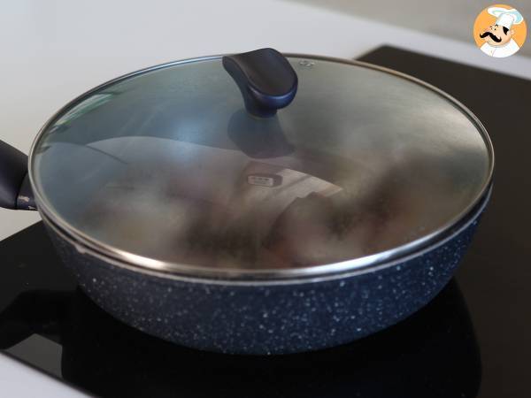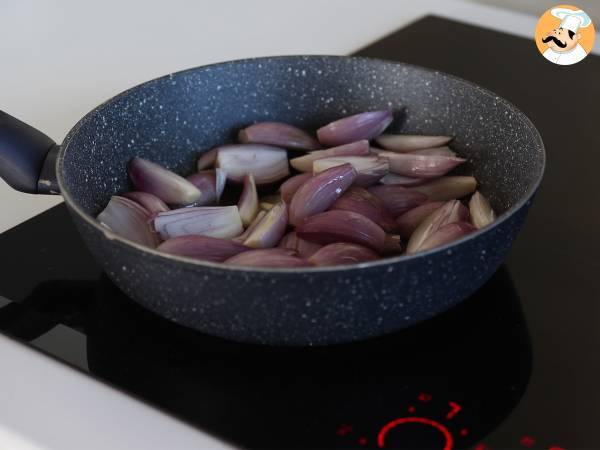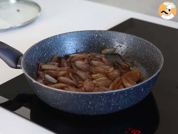 Lorsque les échalotes sont bien dorées, couvrir la poêle et laisser cuire à feu doux pendant 20 minutes.