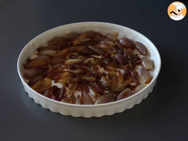 Si votre poêle passe au four, pas besoin de transférer les échalotes dans un plat, recouvrez directement avec la pâte feuilletée, rabattez les bords, piquez, et ça part au four!