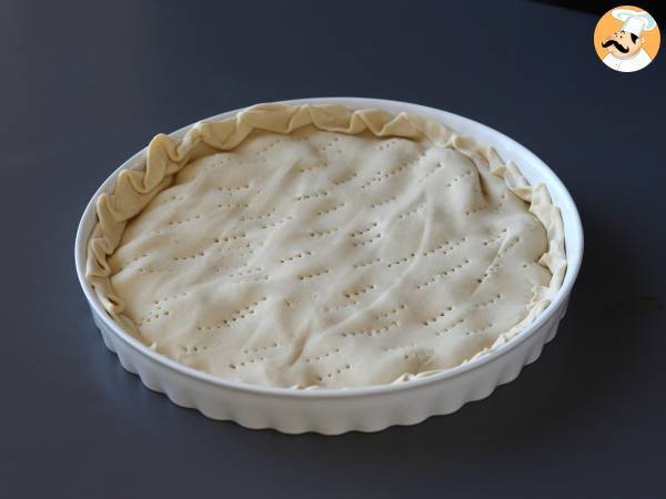 Déposer la pâte feuilletée par dessus et replier les bords. Piquer la pâte à l'aide d'une fourchette.