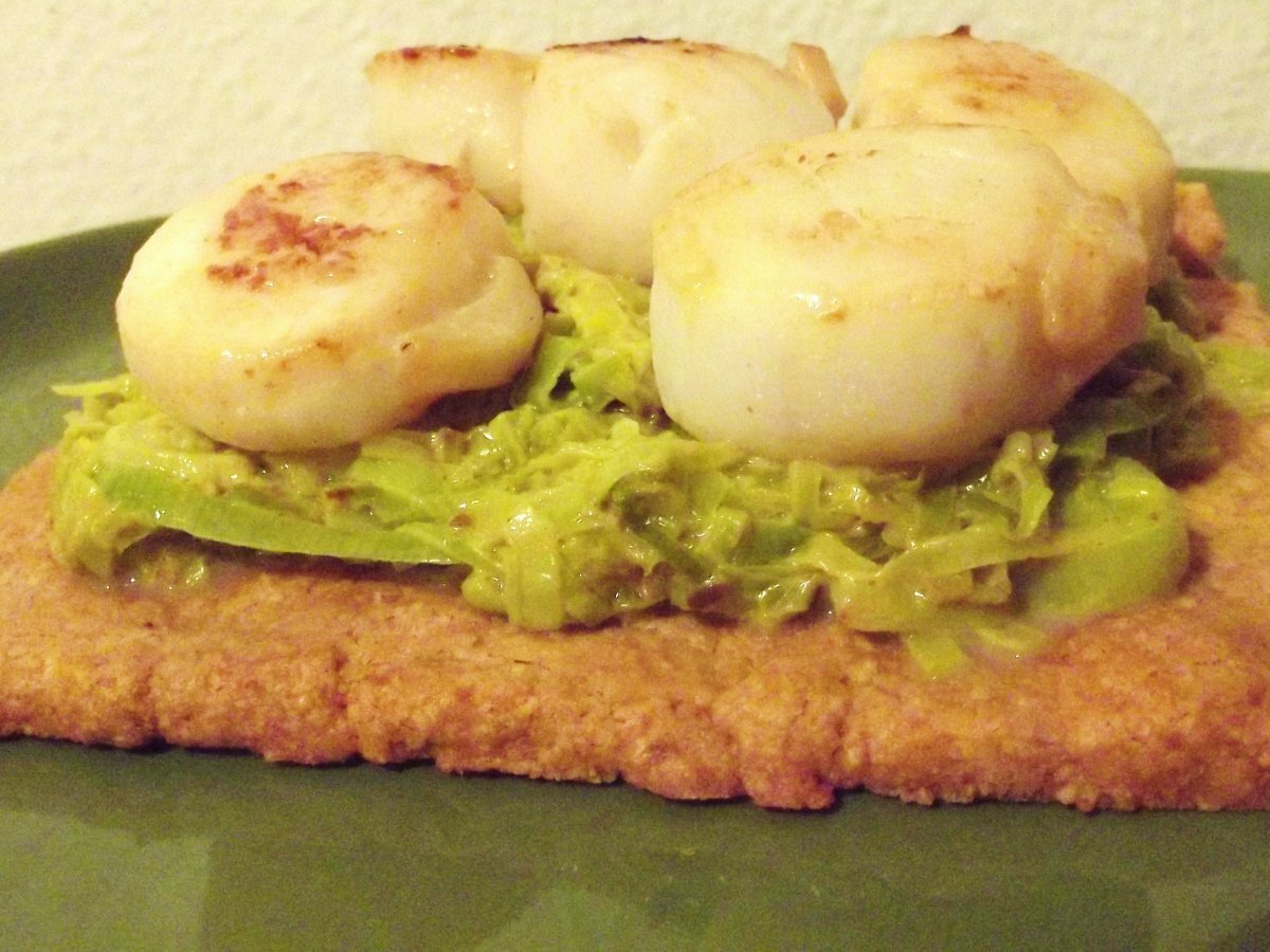 Une fondue de poireaux et des noix de saint-jacques posées sur une pâte à la mimolette.