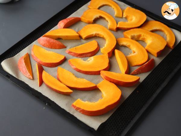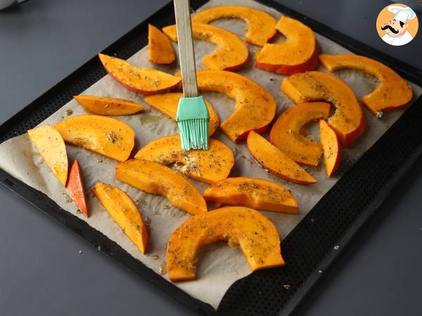 Placer les tranches de potimarron sur une plaque de cuisson recouverte de papier sulfurisé.