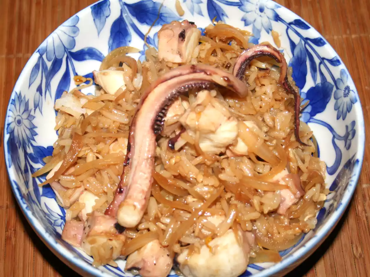 - Le Nasi Goreng est un riz frit agrémenté de poulet, plat indonésien. J'ai remplacé le poulet par des tronçons de tentacule de calamar.