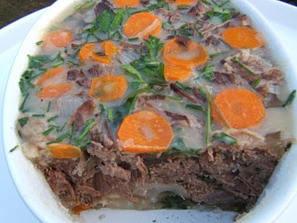 Terrine de boeuf en gelée Platmoyen3 h 20 m Envoyer cette recette à un ami Imprimer cette page Poser une question à l'auteur Publier votre photo de cette recette Ingrédients 12 1 kg de boeuf 1 pied de veau 2 carottes 1 bouquet garni 4 oignons nouveaux + 1 gros oignon piqué d 'un clou de girofle 2 gousses d'ail 1 petit piment frais 1 cuillère à soupe de gros sel de mer 10 grains de poivre persil plat 1 cuillère à café de graines de coriandre