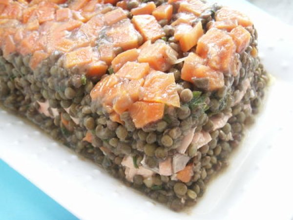 Terrines de lentilles vertes au saumon votez maintenant PrécédentSuivant Platfacile55 min183 Kcal Envoyer cette recette à un ami Imprimer cette page Poser une question à l'auteur Publier votre photo de cette recette Ingrédients 7 4 pavés de saumon dans le filet 300 g de lentilles vertes du Puy 3 carottes 1 poireau 1 oignon 1 bouquet garni 3 brins de persil quelques brins de ciboulette ciselés 40 cl de bouillon de légumes chaud 6 feuilles de gélatine 2 clous de girofle sel et poivre Coût estimé: 12.31Euros€ (1.76€/part)