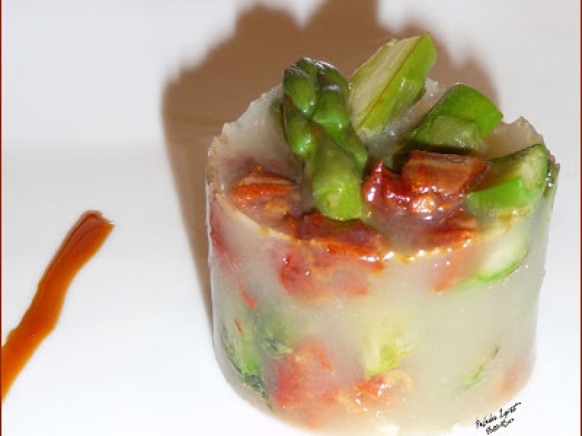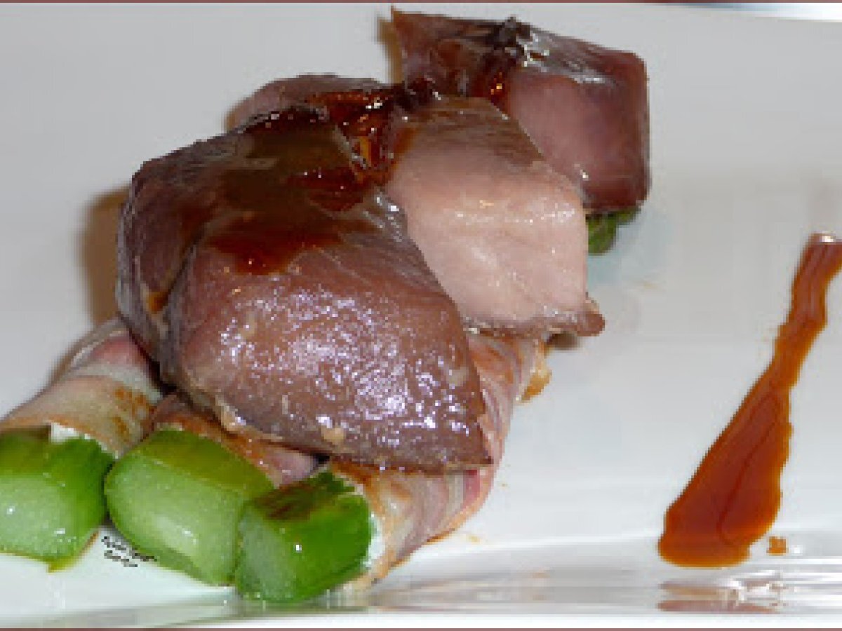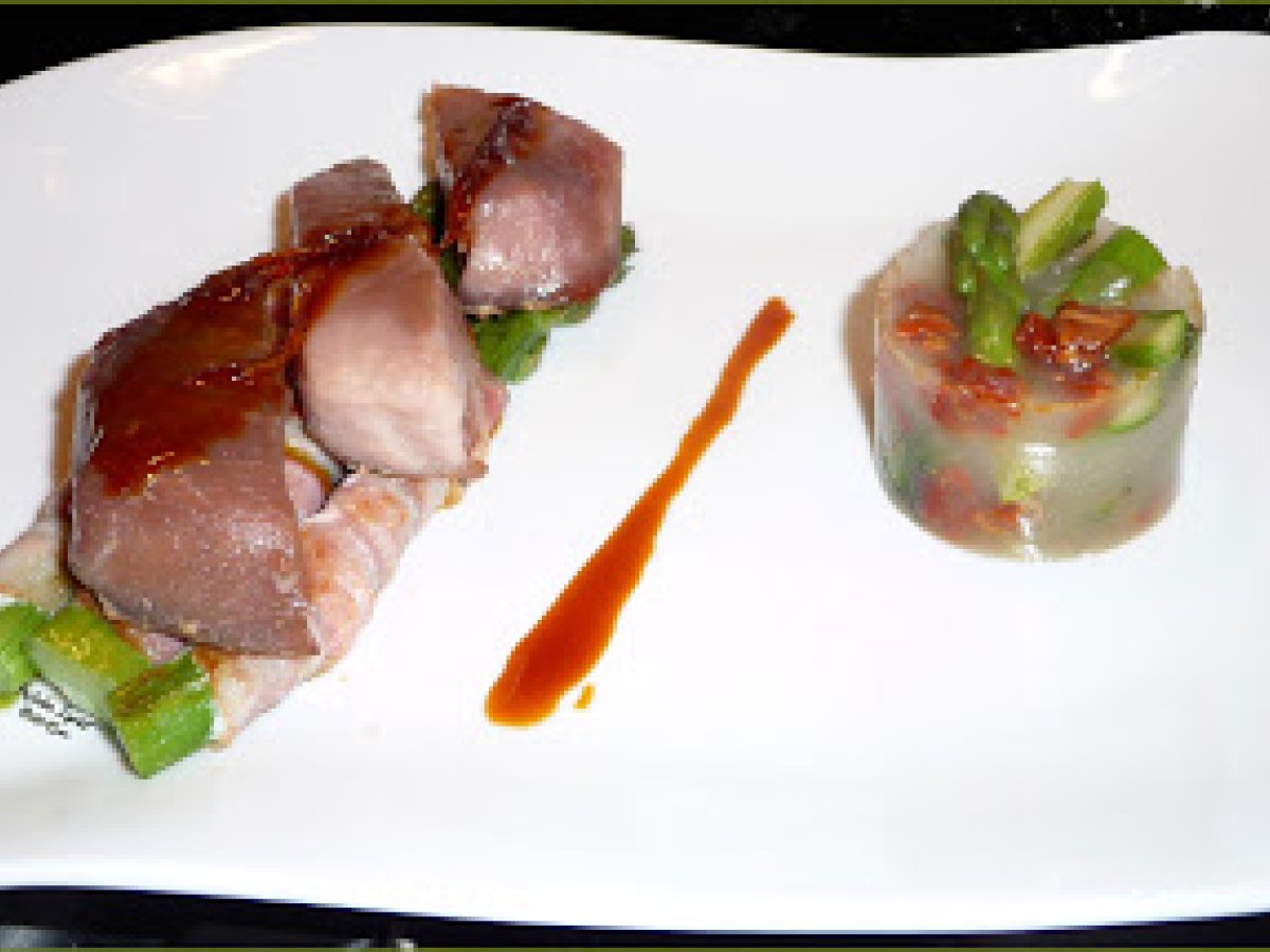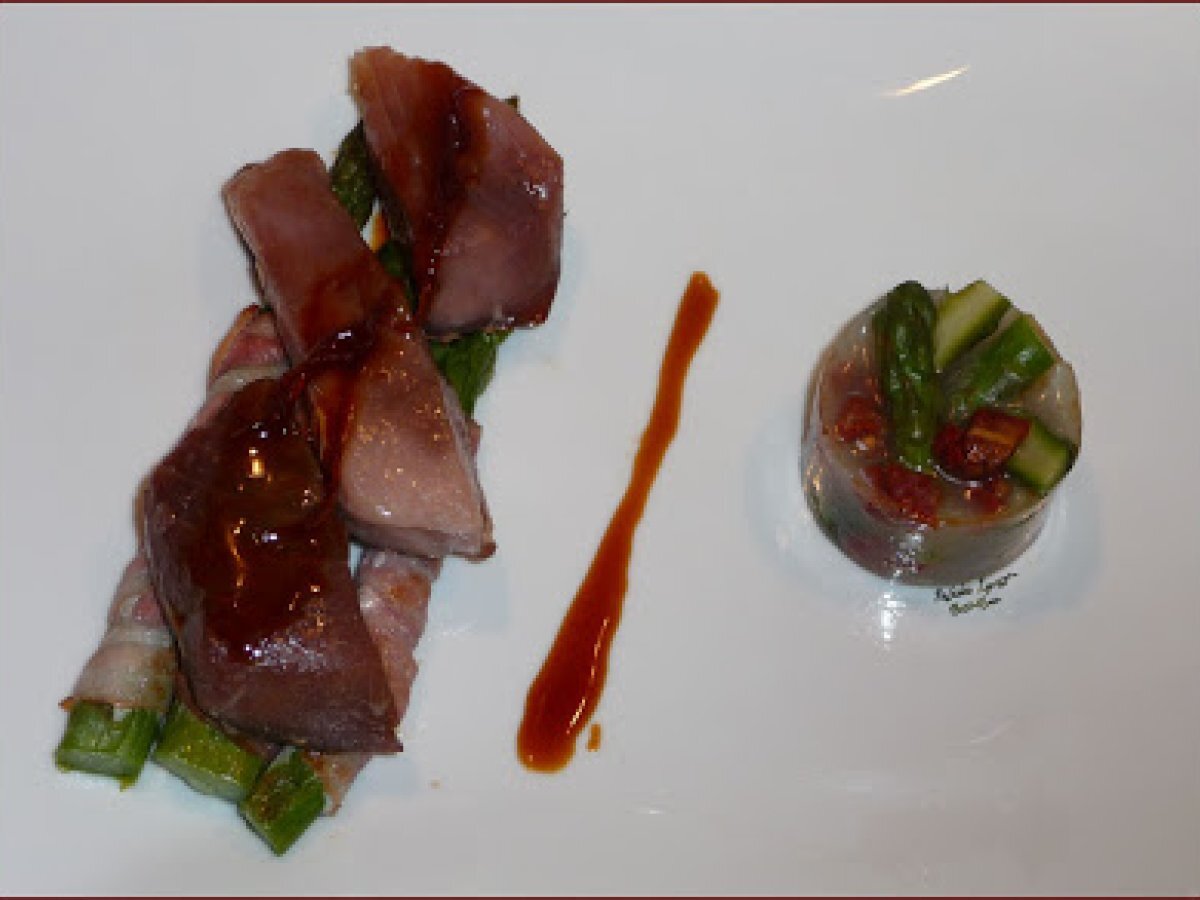 Thon aux asperges lardées,sauce au pamplemousse ... votez maintenant PrécédentSuivant PlatDifficile1 h 30 m Envoyer cette recette à un ami Imprimer cette page Poser une question à l'auteur Publier votre photo de cette recette Ingrédients 2 un joli morceau de longe de Thon Albacore (sans arêtes), un filet de Sauce Soja, 6 belles Asperges Vertes, 6 fines tranches de Lard, 10 pointes d'Asperges Vertes Fines cuites à l'anglaises (eau bouillante salée quelques instants), 1 Tomate séchée 20 cl + 20 cl de Fumet de Poisson, 1 branche de Céleri. 2 Feuilles de Gélatines (6 g), le jus passé de 2 Pamplemousses, le zeste blanchi d'½ Pamplemousse.