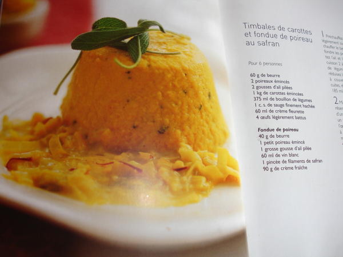 Timbale de carottes et fondue de poireau au safran votez maintenant PrécédentSuivant Platfacile1 h 12 m542 Kcal Envoyer cette recette à un ami Imprimer cette page Poser une question à l'auteur Publier votre photo de cette recette Ingrédients 4 60 g de beurre 2 poireaux émincés 2 gousses d'ail pilées 1 kg de carottes émincées 375 ml de bouillon de légumes 1 cuil. à soupe de sauge finement hachée 60 ml de crème fleurette 4 oeufs légèrement battus Pour la fondue de poireau 40 g de beurre 1 petit poireau émincé 1 grosse gousse d'ail pilée 60 ml de vin blan 1 pincée de filaments de safran 90g de crème fraîche Coût estimé: 6.23Euros€ (1.56€/part)