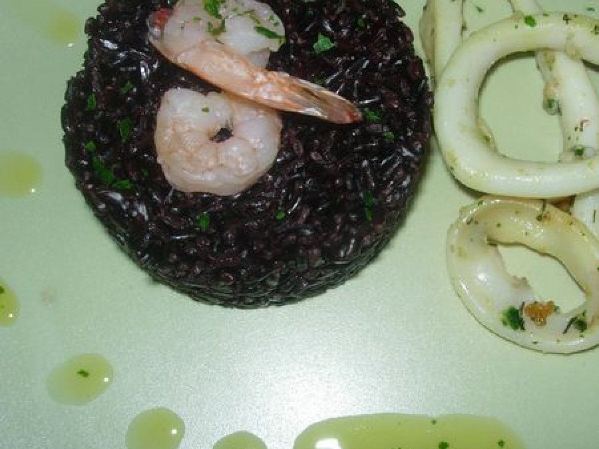 Timbale de riz noir complet dit "vénéré" car interdit & ses encornets en persillades