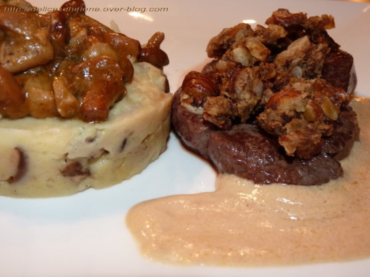 Tournedos en croute de noisettes et de cepes, sauce foie gras votez maintenant Platfacile18 min Envoyer cette recette à un ami Imprimer cette page Poser une question à l'auteur Publier votre photo de cette recette Ingrédients 8 8 tournedos de boeuf 1 oignon 2 sachets de poêlée de champignons sauvages surgelés (environ 900 g) 10 g de cèpes séchés 60 g de noisettes décortiquées 50 g de farine 50 g de beurre 250 g de foie gras mi-cuit 20 cl de crème liquide 1 cuillère à café de Maïzena 1 cuillère à soupe d'huile sel poivre