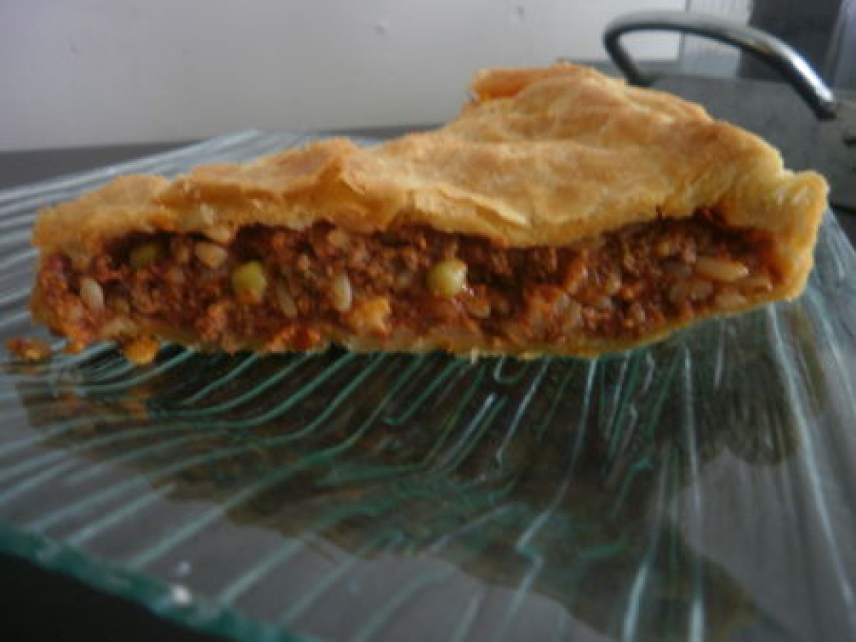 Tourte au boeuf haché. Platfacile1 h 15 m406 Kcal Envoyer cette recette à un ami Imprimer cette page Poser une question à l'auteur Publier votre photo de cette recette Ingrédients 8 2 pâtes feuilletées 400 g de boeuf hachée 400 g de tomates concassées 60 g de petits pois 50 g de riz 1 oignon 1 petite boîte de concentré de tomates 2 Cuillères à soupe de sauce Worcestershire 125 ml de bouillon de boeuf Coût estimé: 12.53Euros€ (1.57€/part)