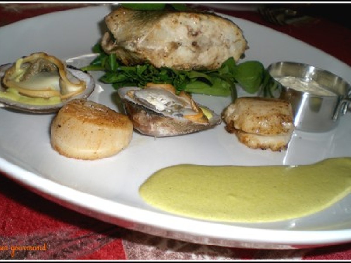 Tronçon de bar de ligne sauce pistache, csj et sa royale de st jacques