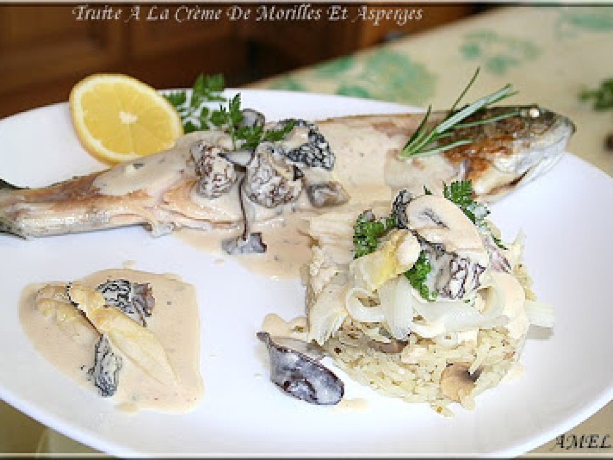 Truite a la creme de morilles et asperges Platfacile1 h 20 m890 Kcal Envoyer cette recette à un ami Imprimer cette page Poser une question à l'auteur Publier votre photo de cette recette Ingrédients 2 TRUITE A LA CRÈME DE MORILLES ET ASPERGES: 2 belles truites Une dizaine de morilles déshydratées 8 pointes d'asperges 20 cl de crème liquide 10 cl de fumet de poisson Sel, poivre Un peu de beurre Une échalote émincée Un citron Un peu persil, ail RIZ PILAF AUX CHAMPIGNONS : Un verre à moutarde de riz Basmati Un verre et demi d'eau + un demi-bouillon de volaille Un demi-oignon, un peu de persil Une tasse de champignons de Paris cuits Un peu de beurre ou d'huile d'olive