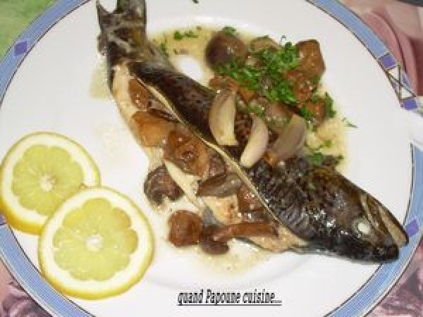 Truites rotie aux champignons des bois Platfacile45 min Envoyer cette recette à un ami Imprimer cette page Poser une question à l'auteur Publier votre photo de cette recette Ingrédients 4 4 truites de 250 g à 300 g 400 g de champignons : chanterelles, cèpes, rosés-des-prés, etc.. (ou mélange de champignons surgelés). 150 g de beurre 4 petits échalotes 2 citrons Persil plat sel
