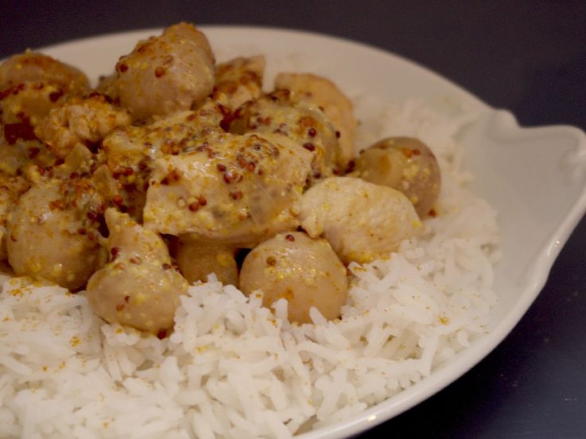 Un plat oublié - poulet moutarde à l'ancienne, curry et champignons Platfacile25 min394 Kcal Envoyer cette recette à un ami Imprimer cette page Poser une question à l'auteur Publier votre photo de cette recette Ingrédients 2 2 blancs de poulet 400 g de champignons de Paris entiers en conserve 15 g de beurre 1 petit oignon 3 cuillères à soupe de crème fraîche 2 cuillères à soupe de moutarde à l'ancienne 2 cuillères à café de curry en poudre sel poivre Coût estimé: 6.15Euros€ (3.07€/part)