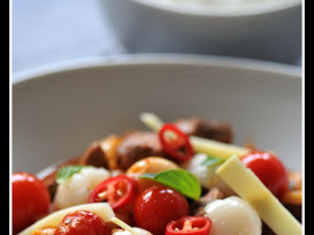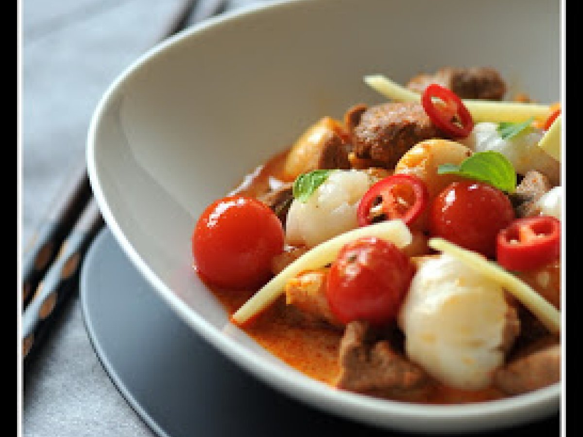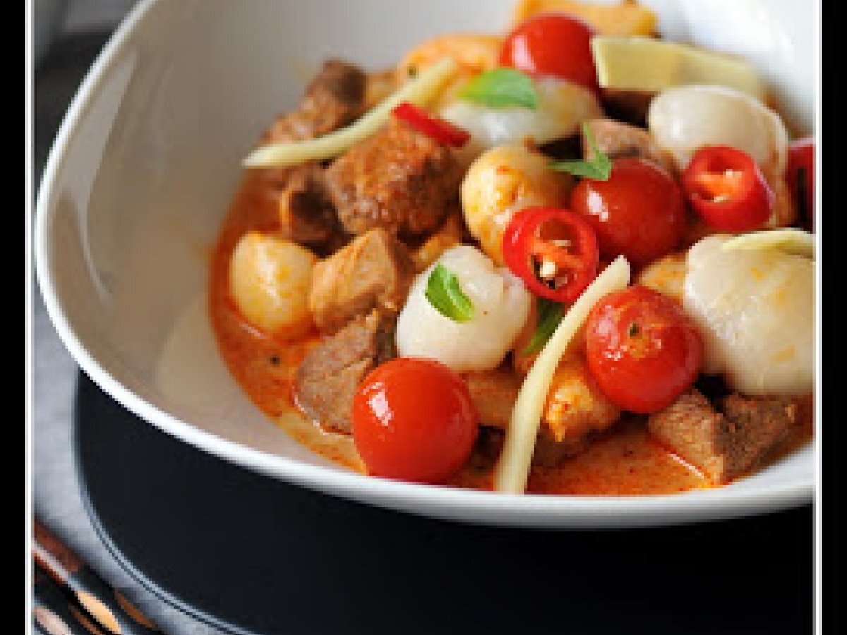 Une dernière recette dans cette cuisine... votez maintenant PrécédentSuivant Platfacile25 min Envoyer cette recette à un ami Imprimer cette page Poser une question à l'auteur Publier votre photo de cette recette Ingrédients 4 2 magrets de canard 1 cuillère à soupe d'huile au piment 2 cuillères à soupe de sauce soja 1.5cm de gingembre frais, râpé 1 gousse d'ail Noix de muscade Poivre blanc 1 cuillère à soupe d'huile de tournesol 1 à 2 cuillère à soupe de pâte de curry rouge 1.5dl de bouillons de légumes 2.5dl de lait de coco 1 cuillère à soupe de sauce poisson 1 cuillère à soupe de sucre de palme 4 feuilles de kafir lime 200g de ramboutan 8 à 10 tomates cherry 2 cuillères à soupe de pousses de bambou Basilic thaï et piment pour décoration