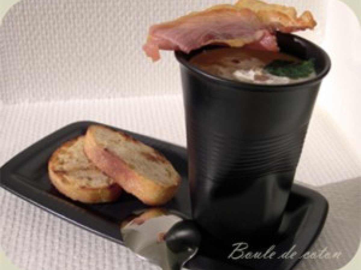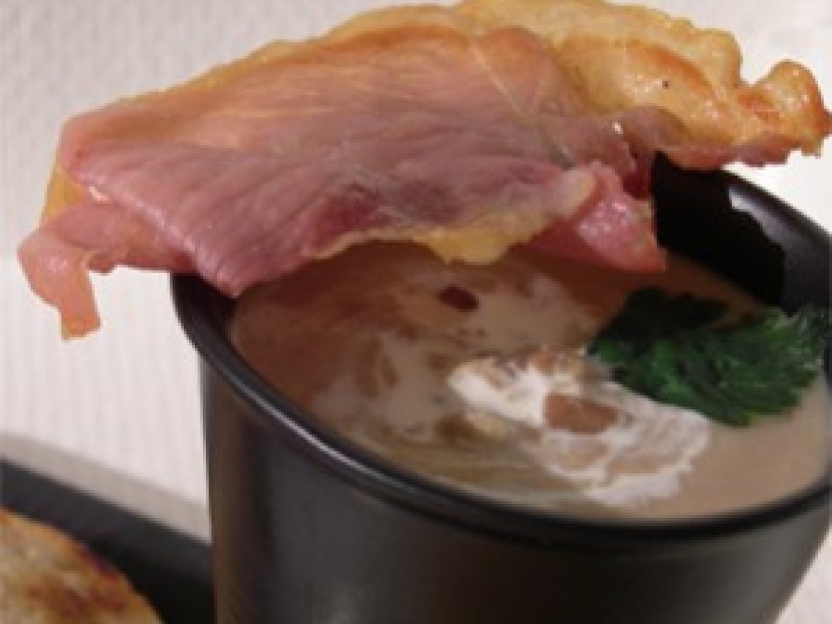Velouté de châtaignes et sa chips de jambon PrécédentSuivant Platfacile45 min Envoyer cette recette à un ami Imprimer cette page Poser une question à l'auteur Publier votre photo de cette recette Ingrédients 4 Pour 4 personnes : 1 grosse boîte de marrons entiers 1 bouillon cube 1 oignon 700 ml d’eau 100 g de lardons 15 cl de crème fraîche liquide sel poivre 2 tranches de jambon de pays