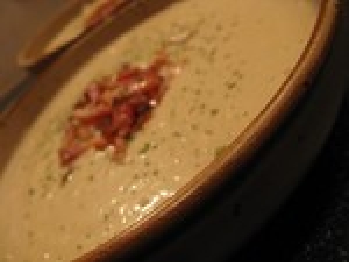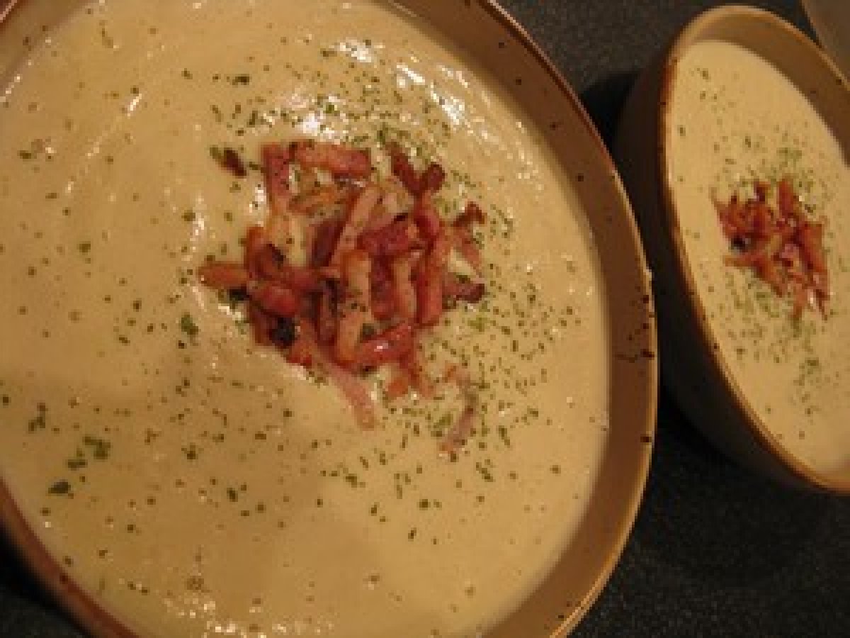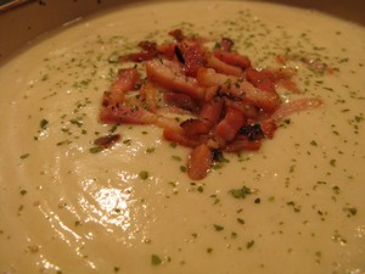 Velouté de chou-fleur et panais aux lardons croustillants.