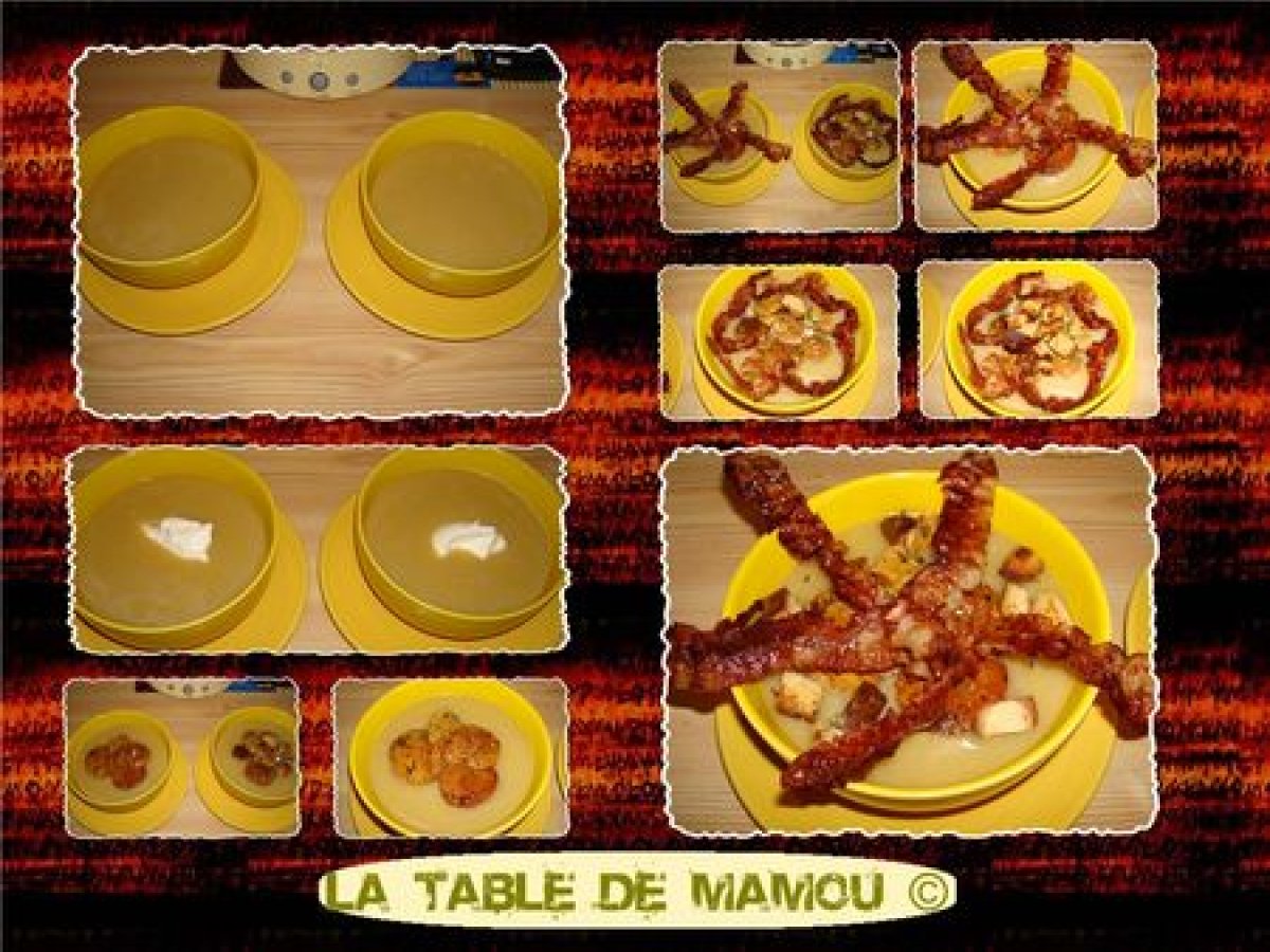 Velouté de topinambours aux cèpes votez maintenant Platfacile30 min3840 Kcal Envoyer cette recette à un ami Imprimer cette page Poser une question à l'auteur Publier votre photo de cette recette Ingrédients 2 500 g de topinambour 3 blancs de poireaux 1 grosse pomme de terre 1 filet d'huile d'olive 1.5 litre d'eau 1 bouillon de boeuf 2 bouillons de poule Poivre du moulin 2 noisettes de beurre 1 bocal de cèpes 100 g de bacon 2 tranches de pain maison 2 cuillères à soupe de crème épaisse persil ail et échalote