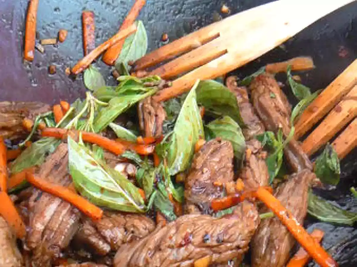 Wok de boeuf au basilic thaï Platfacile19 min Envoyer cette recette à un ami Imprimer cette page Poser une question à l'auteur Publier votre photo de cette recette Ingrédients 3 400 g de bavette 2 carottes moyennes 2 gousses d'ail 30 g de gingembre 1 oignon frais 1 poignée de feuilles de basilic thaï 2 cuillères à café de sucre roux 1 cuillère à café de sauce de poisson 2 cuillères à soupe de sauce soja 1 cuillère à soupe de sauce soja sucrée 1/2 cuillère à café de purée de piment huile de sésame