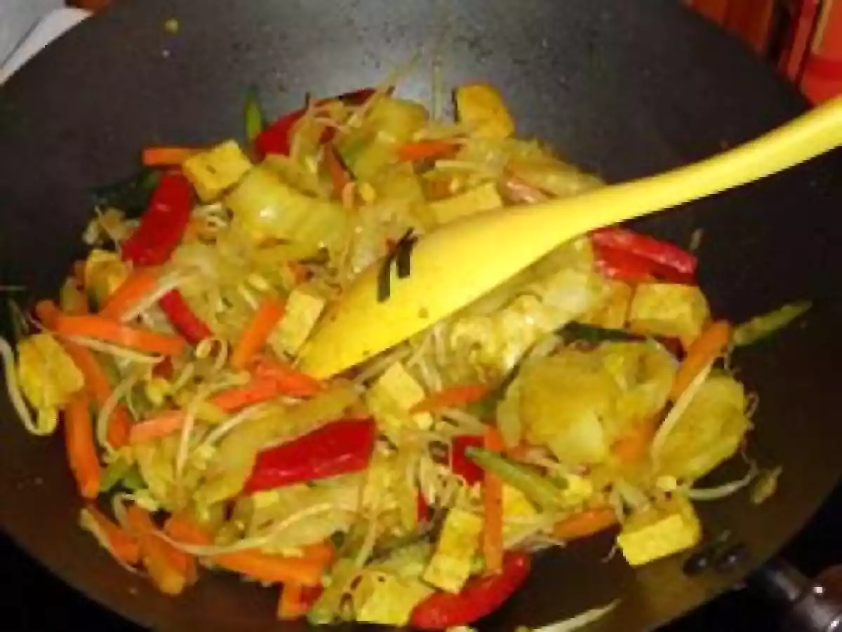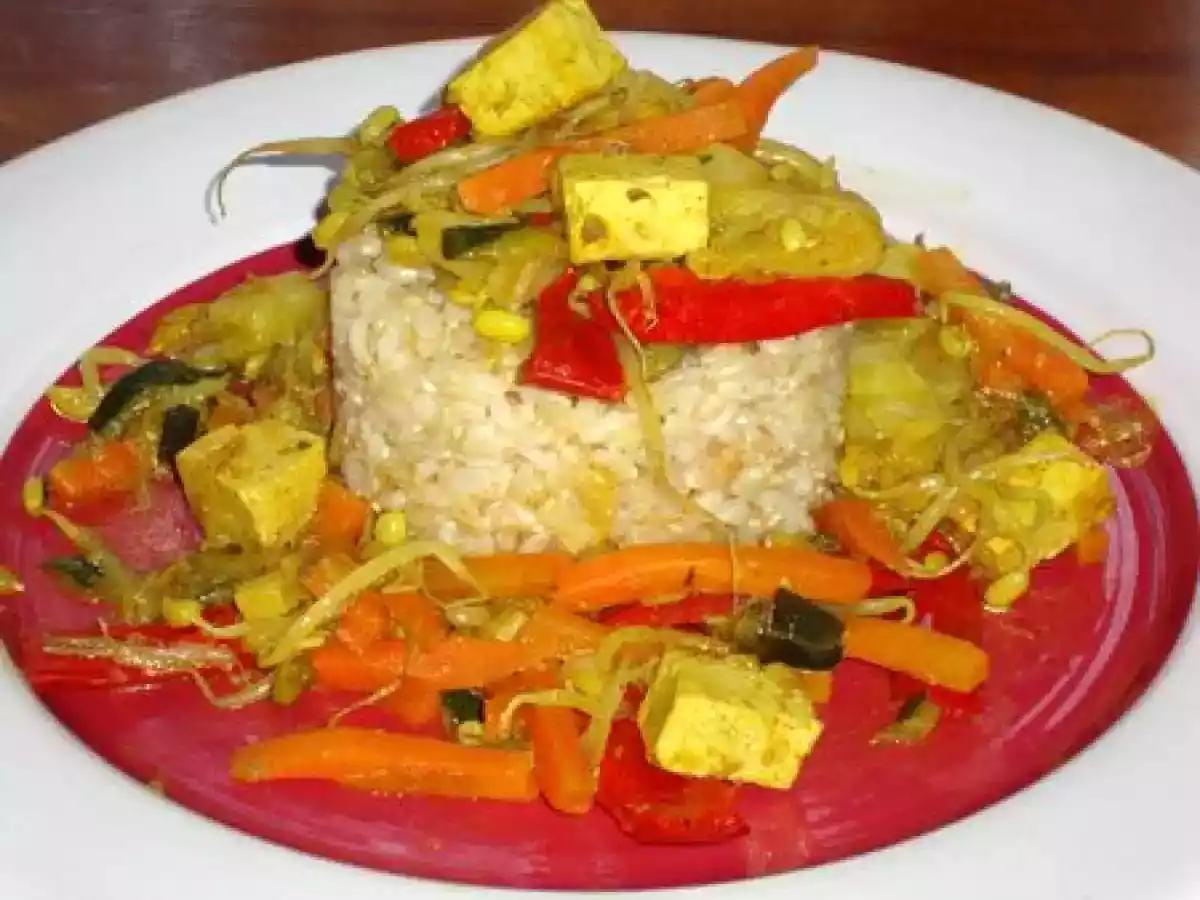 Wok de legumes et tofu au curry sur lit de riz complet PrécédentSuivant Platfacile20 min134 Kcal Envoyer cette recette à un ami Imprimer cette page Poser une question à l'auteur Publier votre photo de cette recette Ingrédients 4 1/4 de chou chinois émincé en fines lamelles 1/2 poivron rouge émincé en fines lamelles 1/2 courgette coupée en julienne 1 carotte coupée en julienne 2 poignées de pousses de soja fraiches 1 petit morceau de gingembre coupée en petits carrés 1 petit bloc de tofu 2 cuillère à café de poudre de curry sel poivre du moulin 1 cuillère à soupe d'huile de cacahuètes