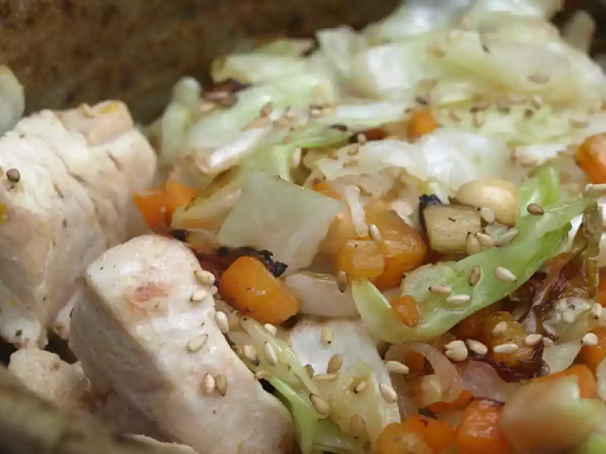 Wok de poulet au chou pommé Platfacile22 min Envoyer cette recette à un ami Imprimer cette page Poser une question à l'auteur Publier votre photo de cette recette Ingrédients 4 2 escalopes de poulet 1/2 chou pommé 3 belles carottes pré-cuites* 1/2 oignon 2 gousses d'ail des graines de sésame de l'huile de tournesol (si votre wok n'est pas anti-adhésif) de l'huile de sésame de la sauce soja du poivre blanc 1 bouillon cube quelques cacahouètes
