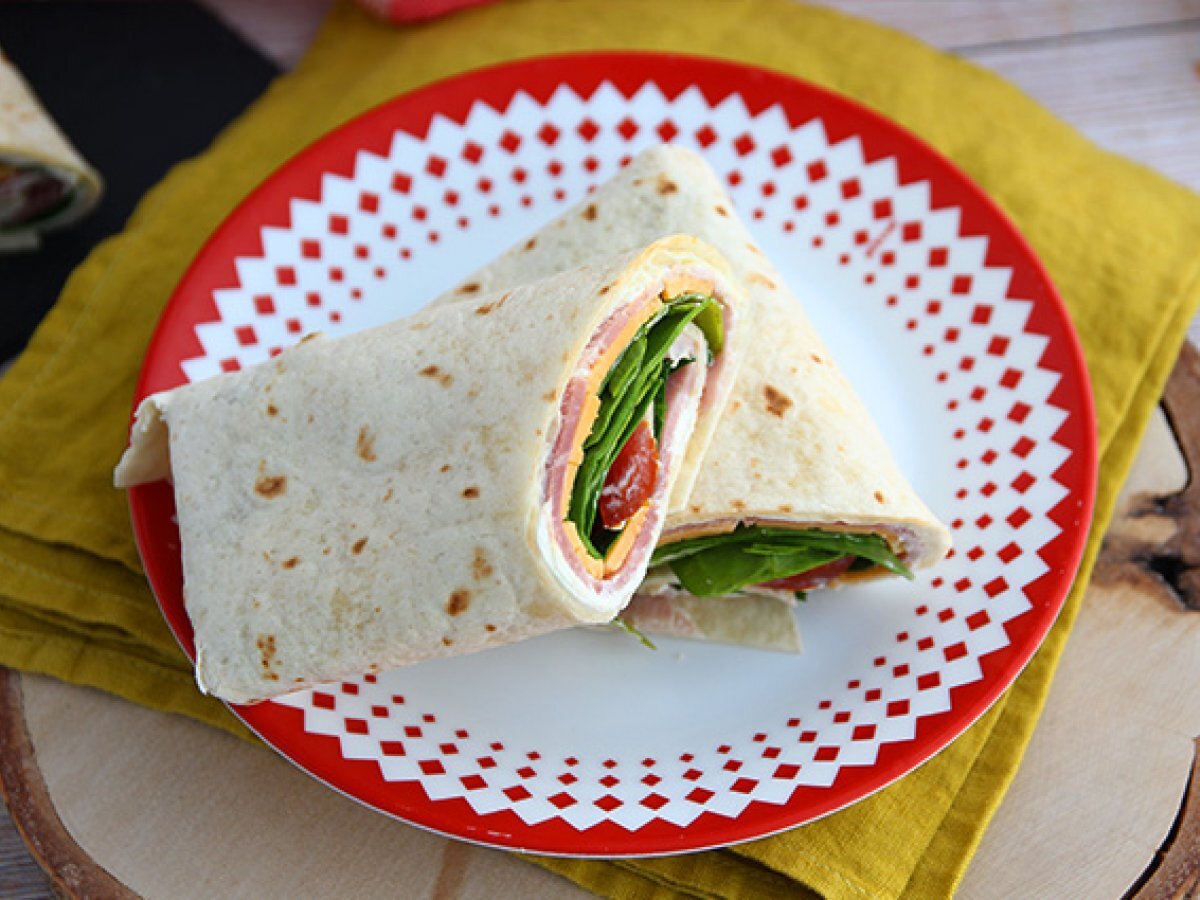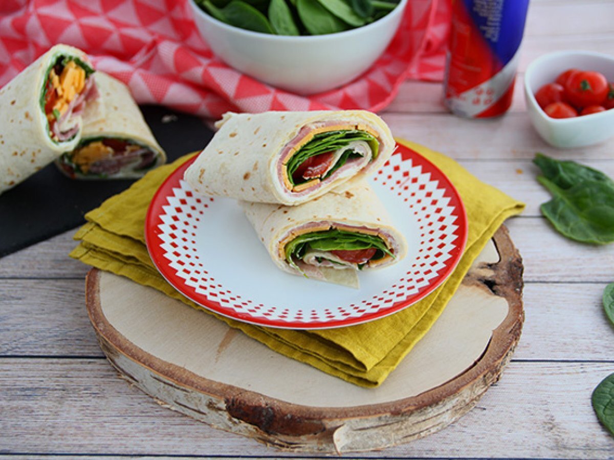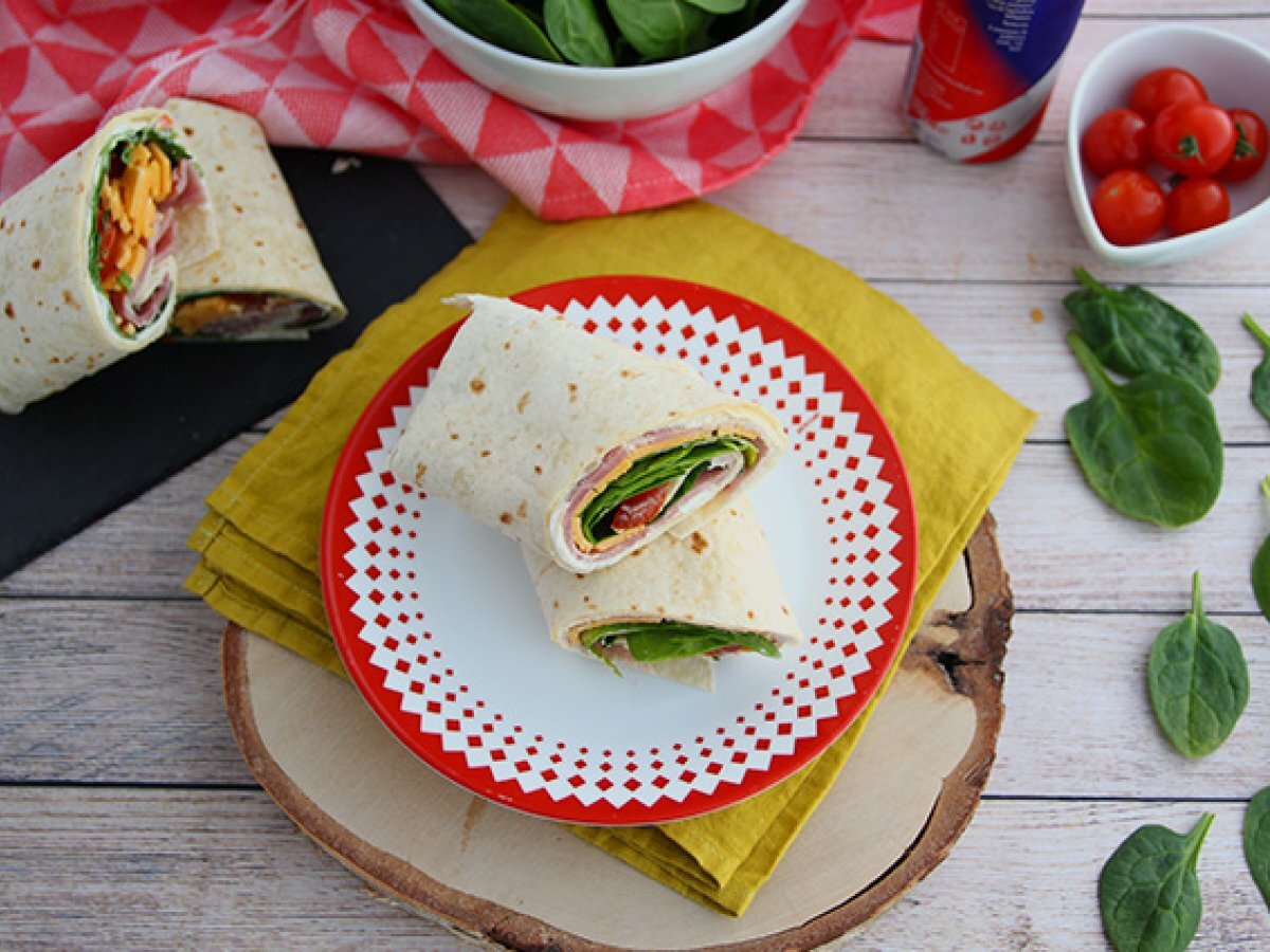 Pour un repas facile, rapide et sans cuisson, testez nos wraps jambon / fromage cheddar / épinards ! Un sandwich plus légers que les traditionnels puisqu'on y remplace le pain épais par des galettes de blé fines et moelleuses. À emporter avec soi en pique-nique ou pour la pause-déjeuner du travail. Et bien sûr on en profite pour ajouter plein de crudités et légumes dans nos wraps afin que toute la famille les dévore sans s'en rendre compte !