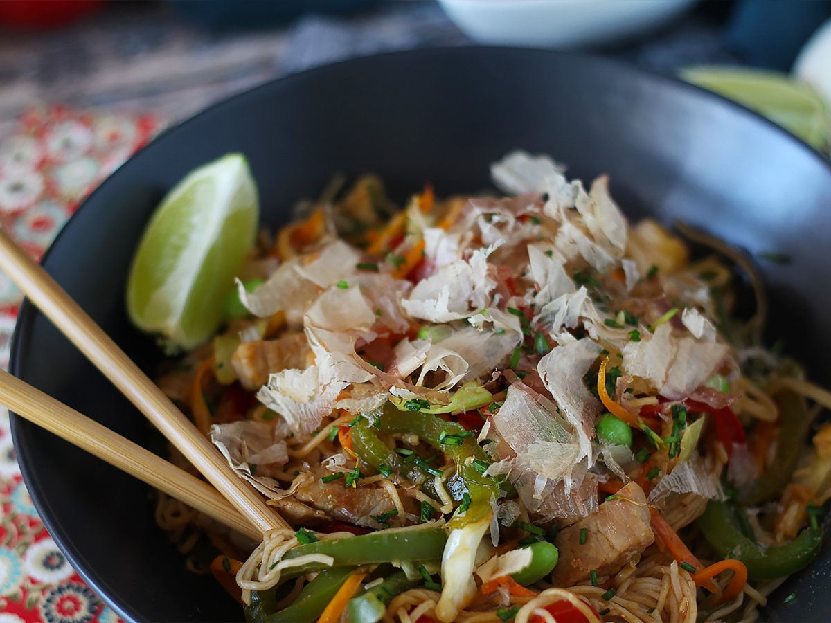Pour un repas complet et savoureux, tentez ce Yakisoba ! Un plat asiatique réalisé à base de nouilles soba, de viande de porc et de légumes. On vous accompagne pas à pas dans la réalisation de cette recette ultra simple qui sera parfaite pour un plateau-télé. Et n'oubliez pas les baguettes pour la dégustation ;-)