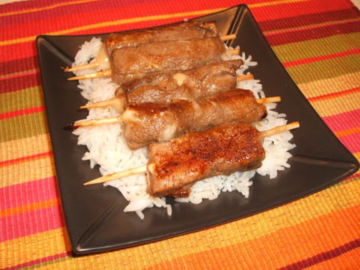 Yakitori boeuf fromage sauce teriyaki Platfacile40 min499 Kcal Envoyer cette recette à un ami Imprimer cette page Poser une question à l'auteur Publier votre photo de cette recette Ingrédients 2 20 tranches de carpaccio 200 g de leerdammer coupé en cubes (environ 60) 1/2 verre de riz 1 cuillère à soupe d'assaisonnement pour le riz à sushi Kikkoman Pour la marinade : 2 cuillères à soupe de sauce teriyaki Kikkoman 2 cuillères à soupe de sauce soja 1 cuillère à soupe de miel le jus d'un citron vert 2 cuillères à soupe de vinaigre chinois ( vinaigre noir fait à partir de riz) poivre Coût estimé: 6.89Euros€ (3.44€/part)