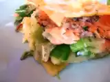 Ingrédients: 1 pâte feuilletée 200 g de saumon fumé 200 g de lardons 500 g de poireaux 1 gousse d'ail 2 oeufs Persil haché 25 g de beurre 20 cl de crème...