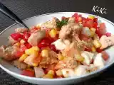 Ingrédients: Salade : 2 blancs de poulet 140 g de maïs [une petite boîte de maïs] 1 poivron rouge 3 tomates 1 boule de mozzarella 4/5 cuillères à soupe de...