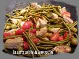 Ingrédients: 1 filet mignon de porc quelques olives vertes farcies à l'ail une boite de haricots vert des tomates cerises un oignon une gousse d'ail 20 cl de...