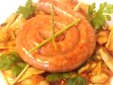 Ingrédients: 500 g de saucisson 500 g de haricots verts 2 oignons 1 c. à soupe d'huile 2 à 3 tomates 1 c. à soupe de farine sel persil et l'aneth hachés