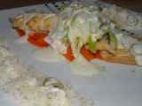 Ingrédients: 1 filet de lieu noir 1/2 carotte 1/2 poireau 40 g de riz 5 cl de jus de tomate 4 olives 3-4 cl de jus de citron 5 cl de crème fraîche semi-épaisse...
