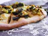 Ingrédients: 250 g de farine de petit épeautre à levure intégrée 20 g de farine de blé 125 ml d?eau tiède 1 petit poireau (200 g) 1/2 boule de mozzarella du sel