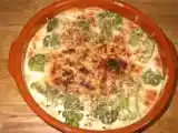 Ingrédients: 500 gr de brocolis 1 oignon 2 cuillères à soupe de farine 500 ml de lait 150 gr de gorgonzola ou d'emmental râpé 50 gr de chapelure amandes...