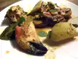 Ingrédients: 4 cuisses de poulet 100 g de poudre de colombo 2 cuillères à café de graines à roussir Huile d'olive Pommes de terre 1 aubergines Thym persil...