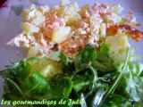 Ingrédients: 1 kilo de pommes de terre 200 g de saumon fumé gruyere râpé béchamel maison ( 30 g de beurre fondu en casserole avec une cuillère à soupe de...